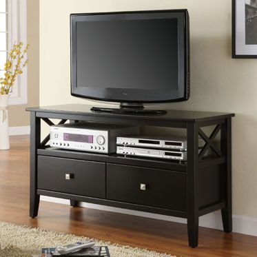 X Side 2 Drawer Media Console TV Stand. The Black X-Side Media Console provides a casual modern stage for your television. Its 25-3/4" height makes this a perfect fit for any living room. Consisting of two deep drawers and one shelf, the stand provides ample storage space for all of your audio and video components. Finished in a dark black, this piece will accentuate most home dcors. 45-1/2" x 16-3/4" x 25-3/4" H Some assembly required.../ X Side 2 Drawer Media Console TV Stand / Tall Tv Stands